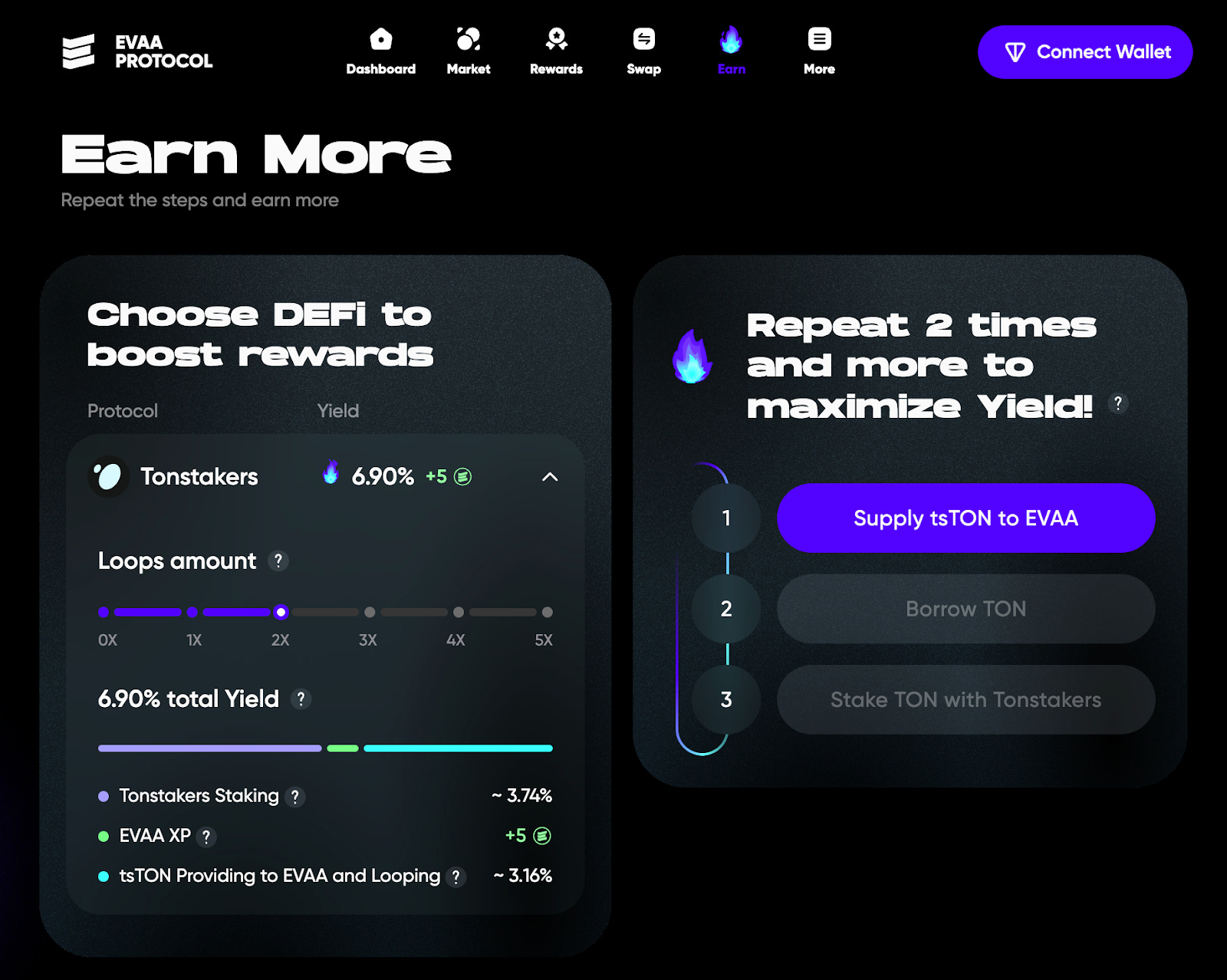 The heart of this upgrade lies in leveraged liquid staking—a strategy that amplifies staking rewards while preserving liquidity. Tonstakers’ tsTON, a liquid staking token integrated across major TON DeFi protocols, powers this system, allowing users to earn additional rewards beyond standard staking yields. The EVAA Earn section brings three standout benefits: